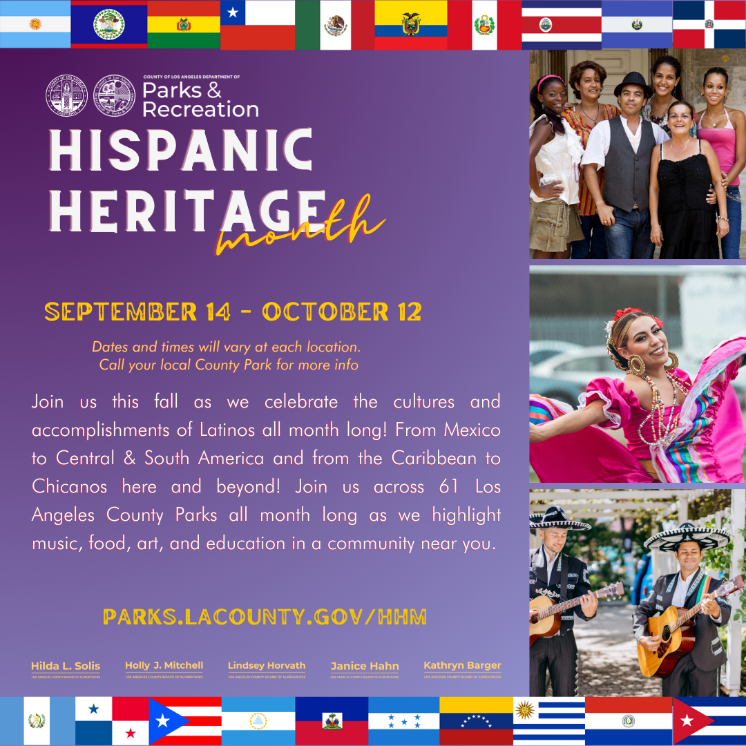 Join us at one of our parks this month to celebrate the many accomplishments of Latinos! From Mexico to Central America and from South America to the Caribbean and to the Chicanos right here in America and beyond!
