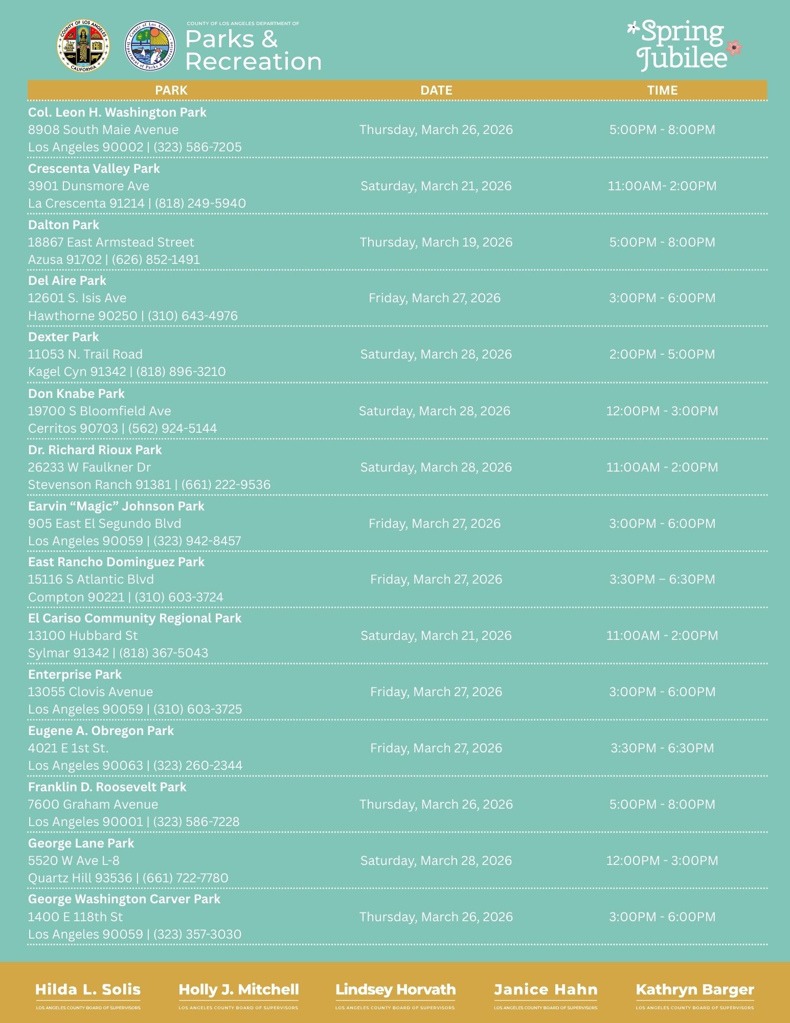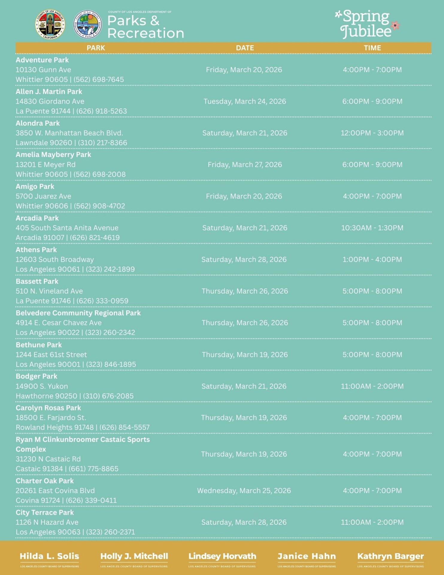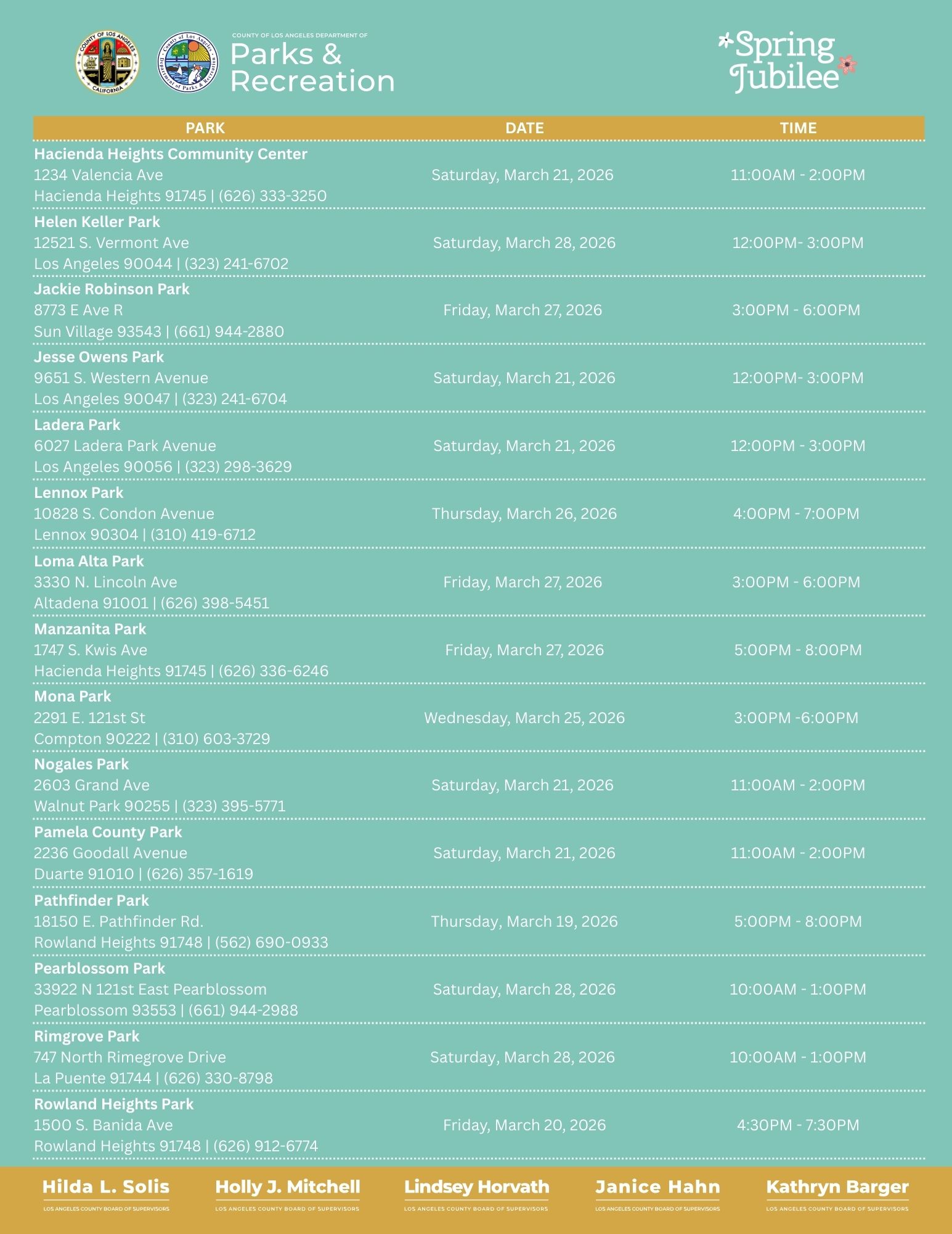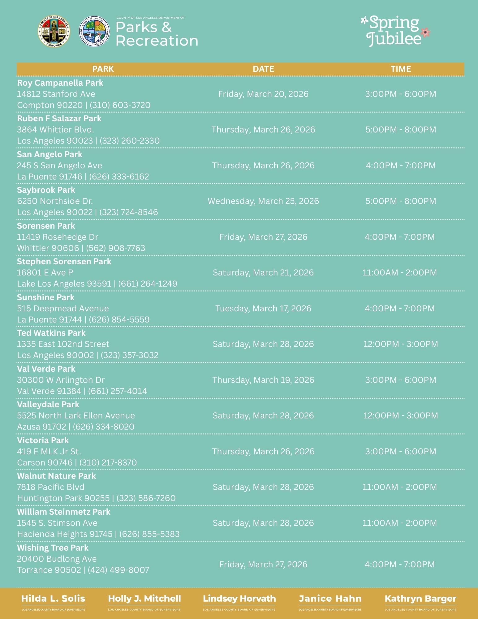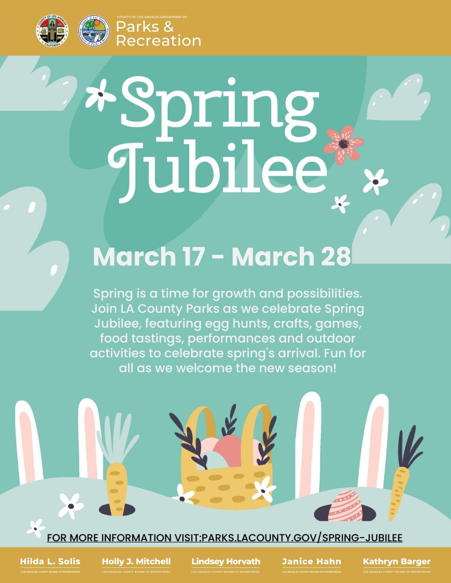 Join us as we celebrate upcoming the Spring Jubilee events throughout Los Angeles County. Events will include Performances, Workshops, Egg Hunts, Edible Crafts, Community Activities, Food Tastings and more at your local LA County Park.