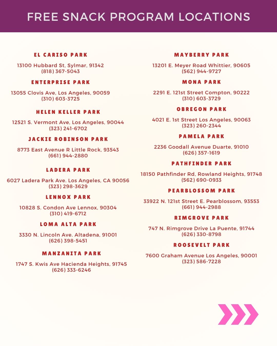 The Los Angeles County Department of Parks and Recreation, in partnership with LA County Library, proudly offers the Free Lunch and Snack Program, providing nutritious meals to children and youth ages 0-18 at participating parks and libraries throughout Los Angeles County.
