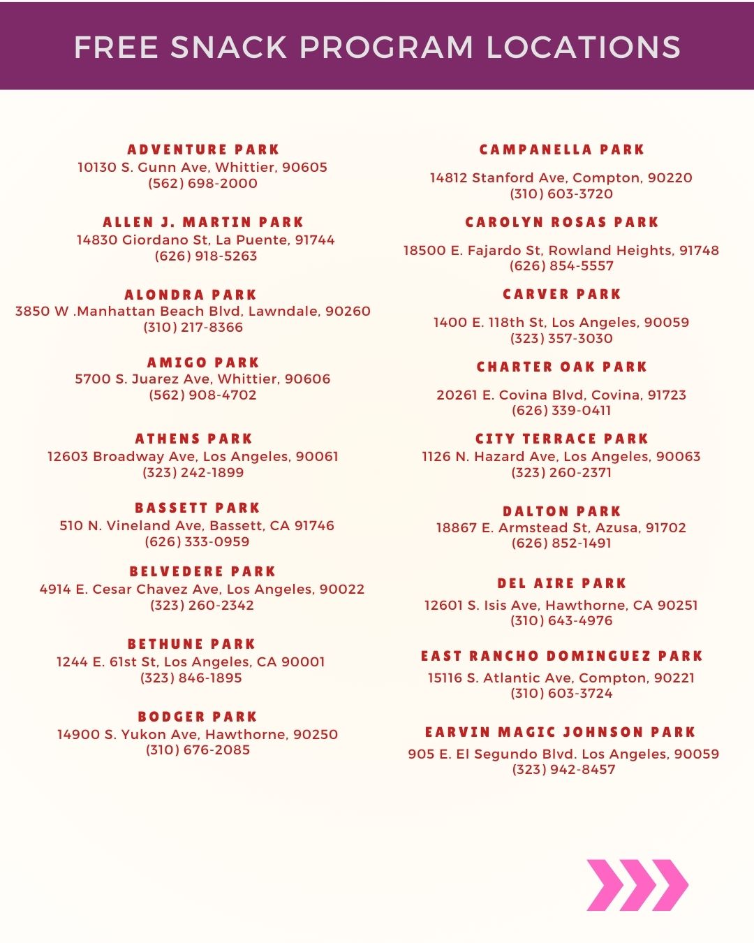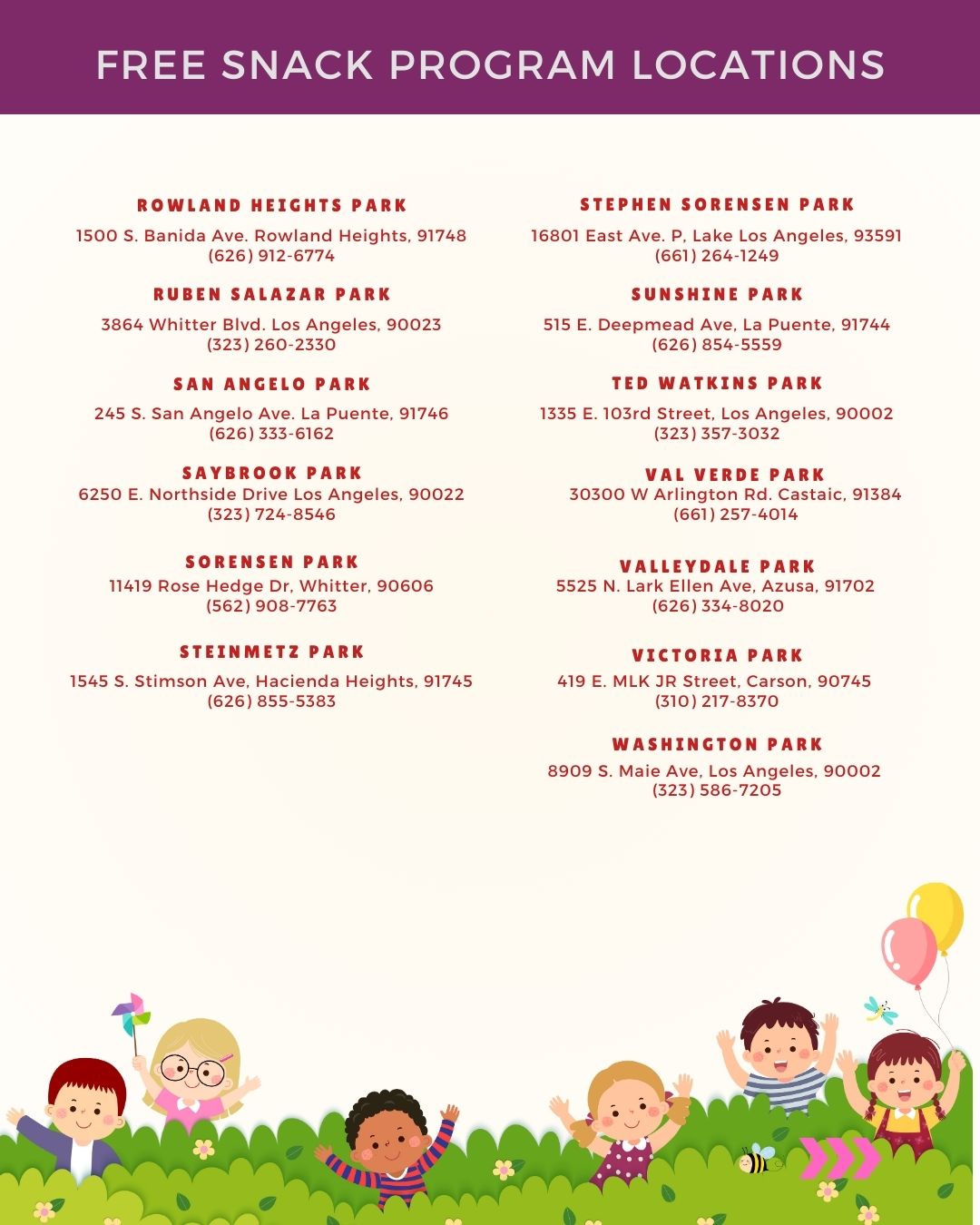 The Los Angeles County Department of Parks and Recreation, in partnership with LA County Library, proudly offers the Free Lunch and Snack Program, providing nutritious meals to children and youth ages 0-18 at participating parks and libraries throughout Los Angeles County.